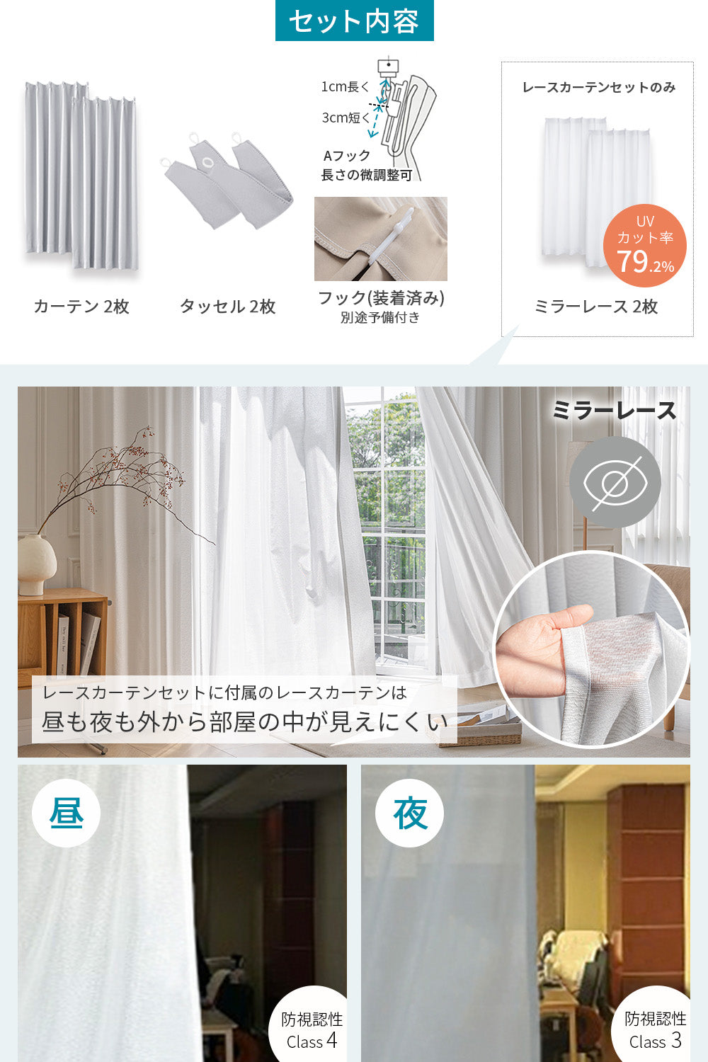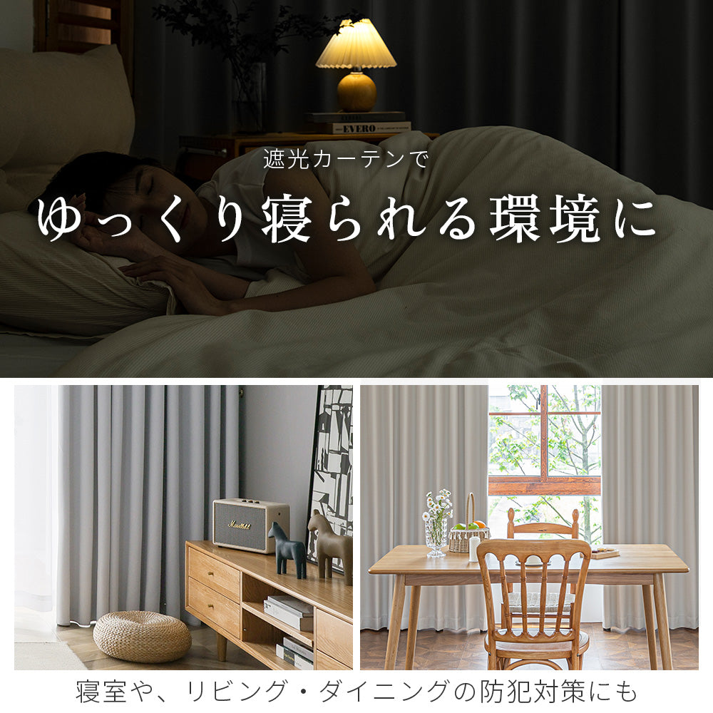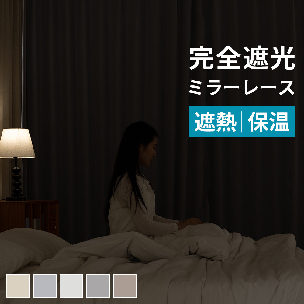 完全遮光カーテンとミラーレースカーテンのお得なセット。寝室、リビングなど防犯対策に。省エネ効果も抜群。丸洗いOK形状記憶付き。